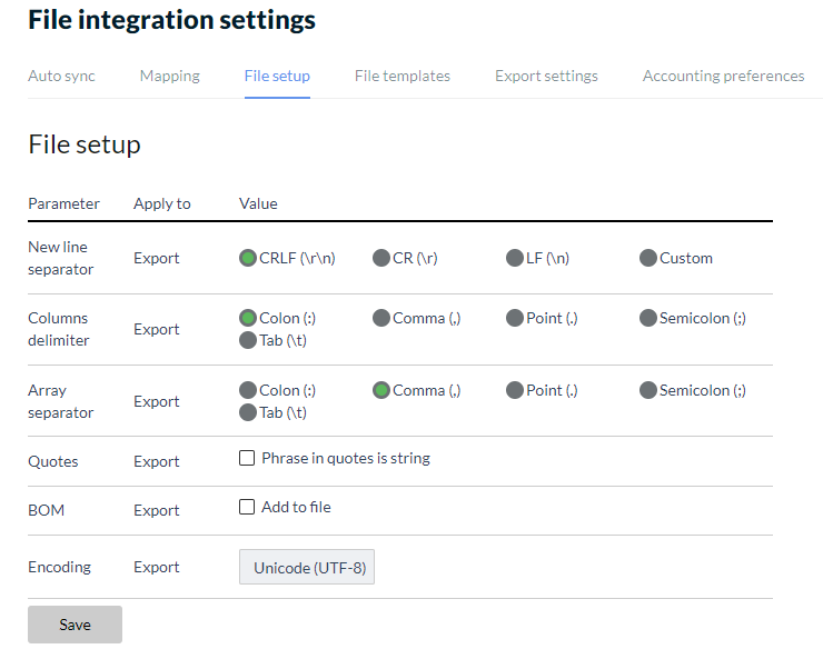 Whether you choose to standard sync or automatic export files, you need to configure the format of the integration files so that it matches that of your back-end system. Use the "File integration" subtab to configure the settings for record exports.