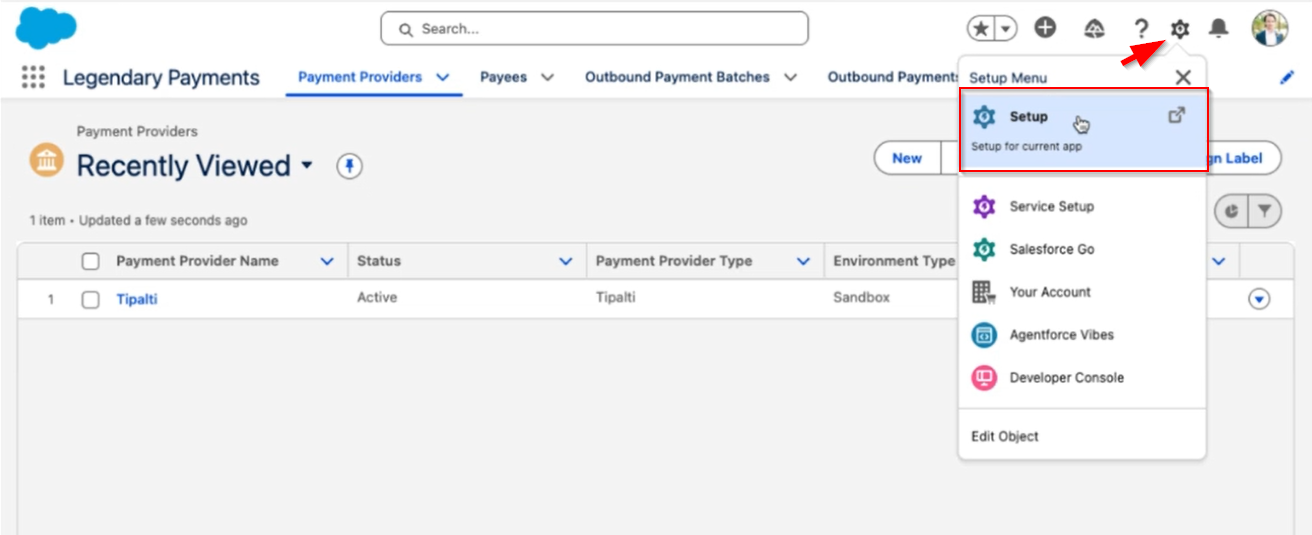 - Login to Legendary Payments inside Salesforce, click the Gear icon and choose Setup.