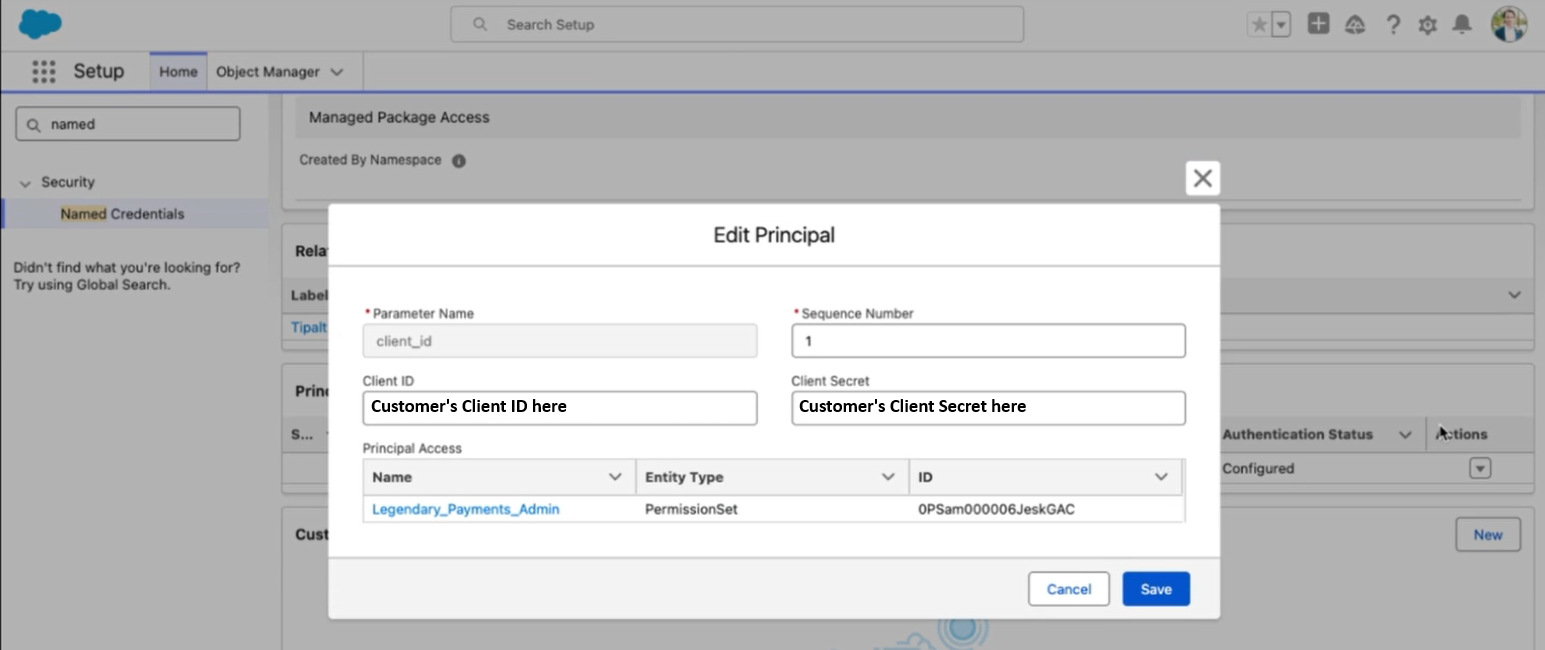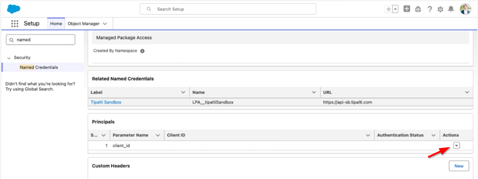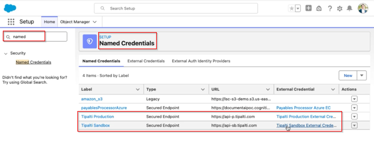 - Search inside Setup for Named Credentials. From the Named Credentials page, click into the Tipalti Sandbox or Tipalti Production External Credential column.