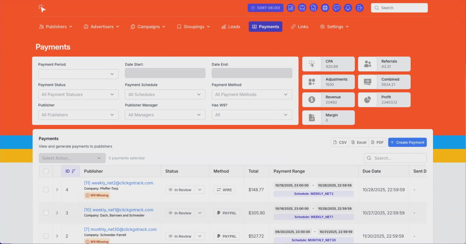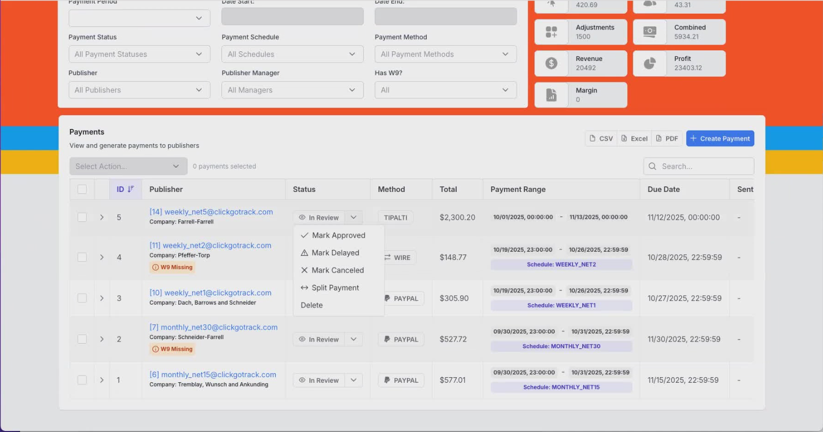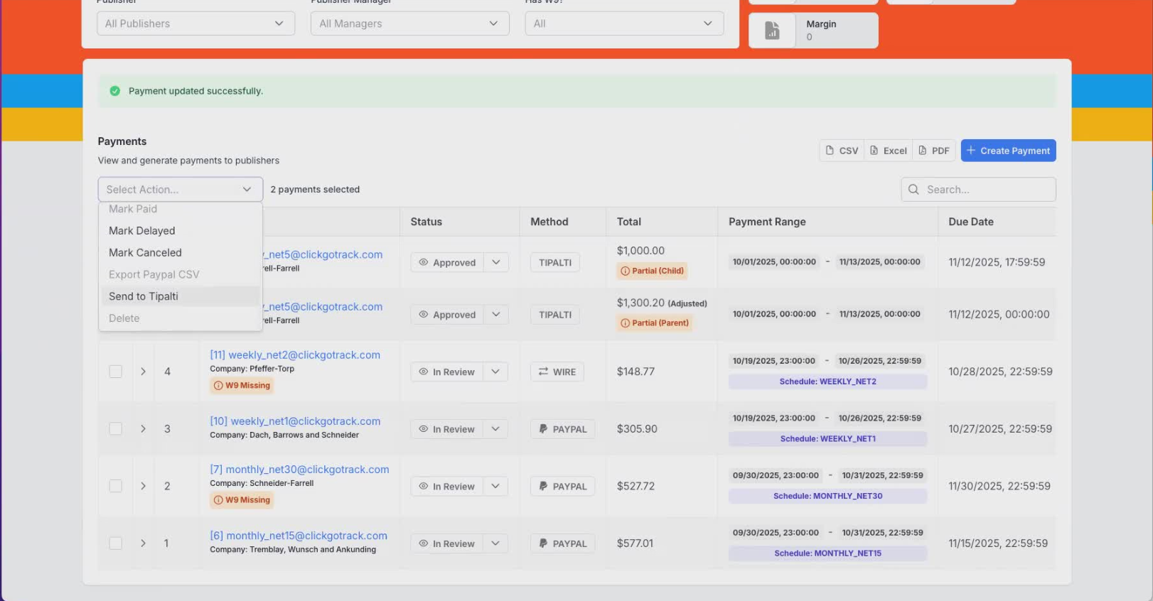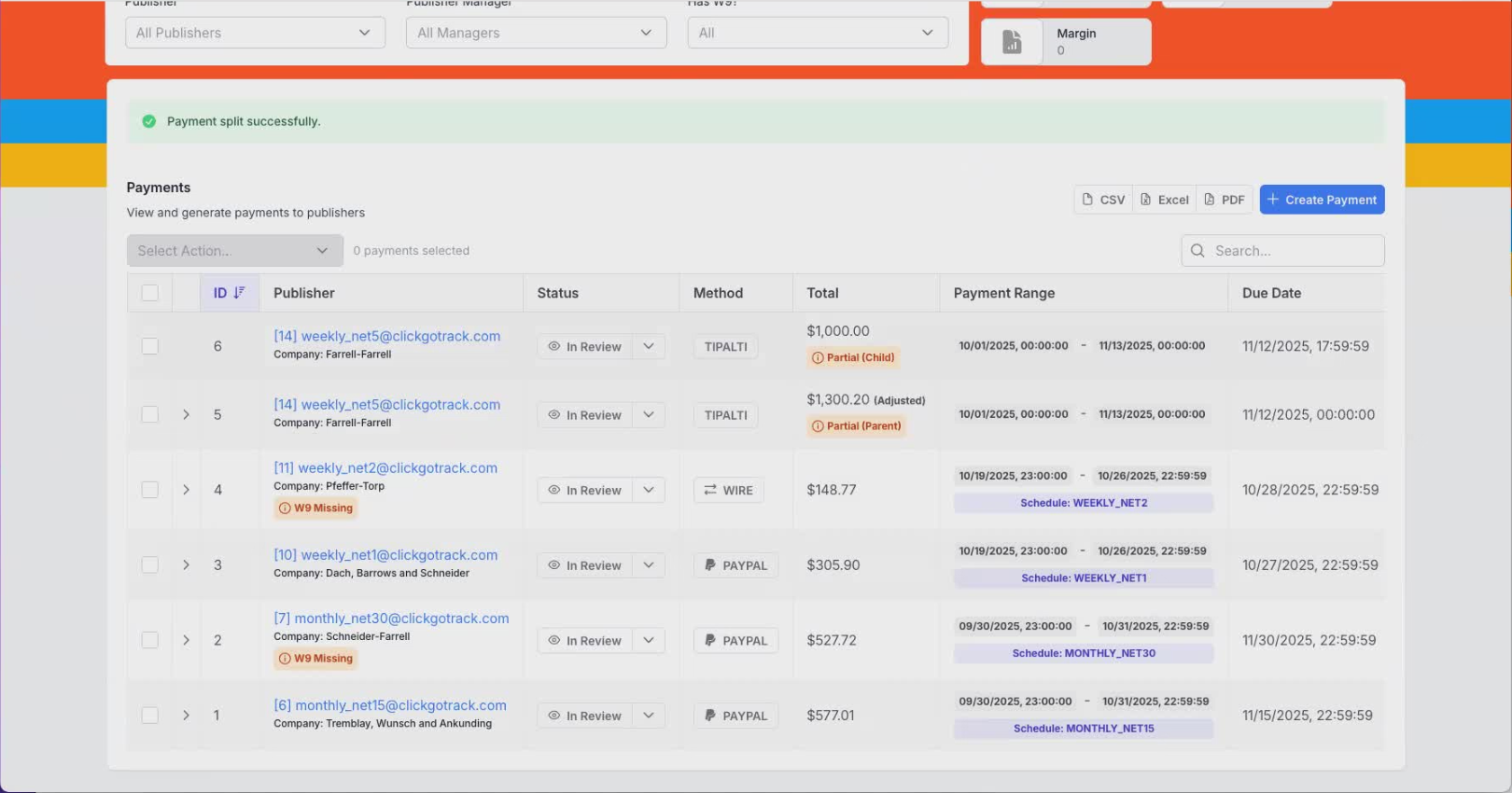 - Payments in ClickGoTrack can be split into multiple payments to be sent to Tipalti. The example shows the payment being split into two payments. Click the Split Payment option from the Status column to do this.