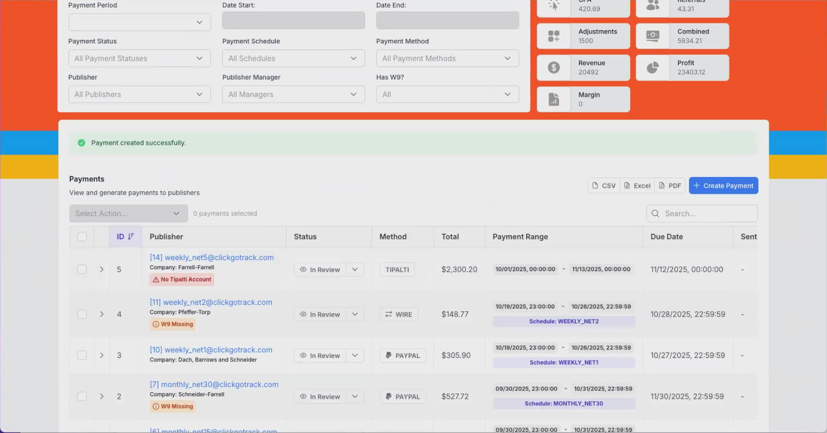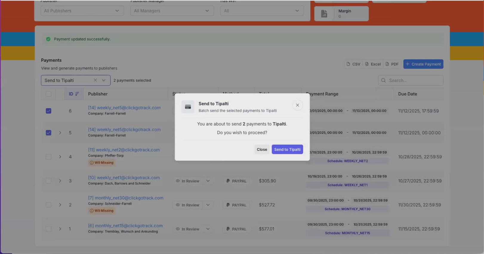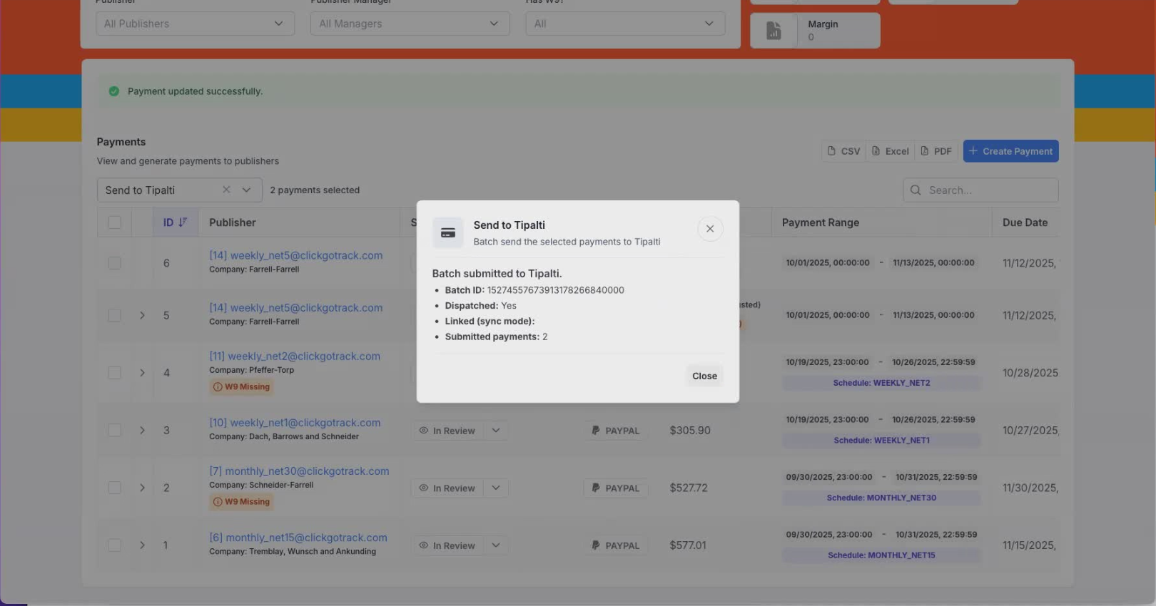 - The payment is created. If Tipalti onboarding has not been completed for the Publisher, "No Tipalti Account" appears in red below the Publisher name.