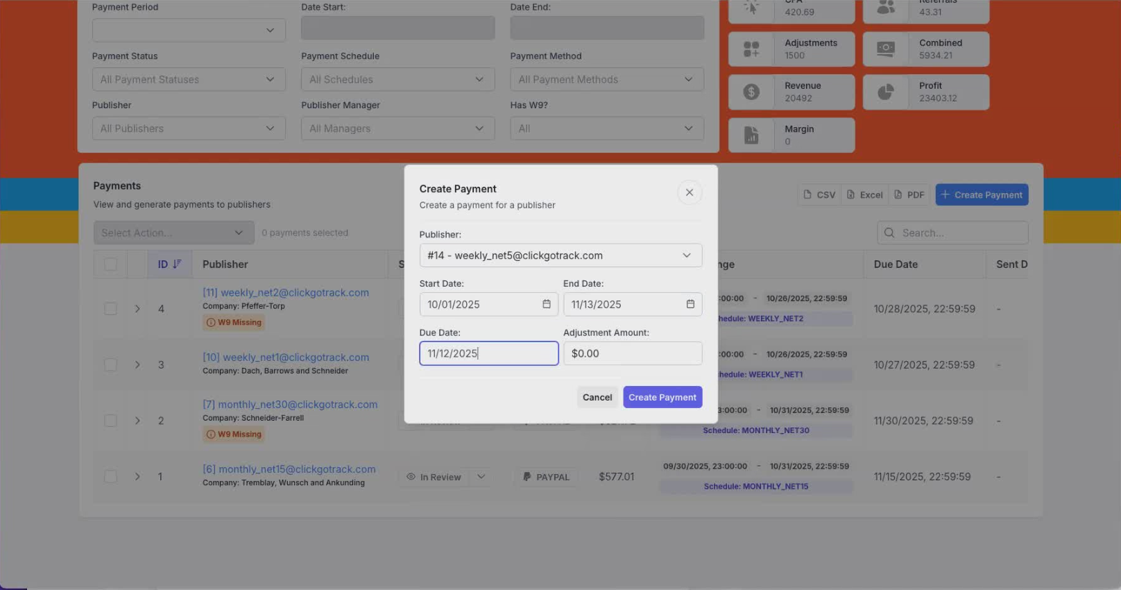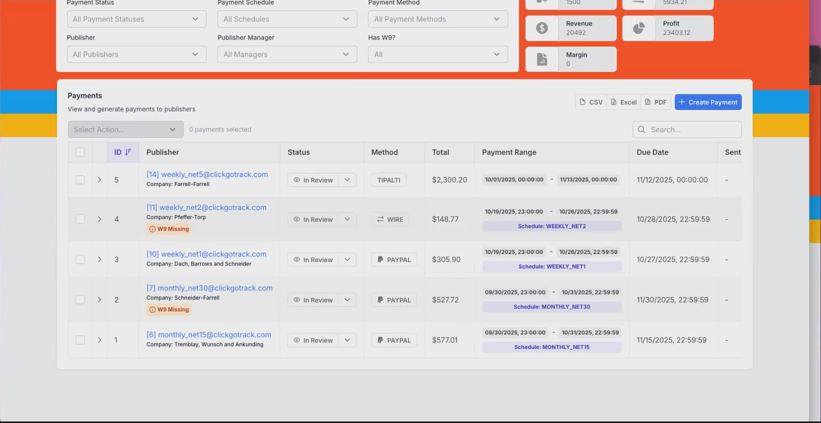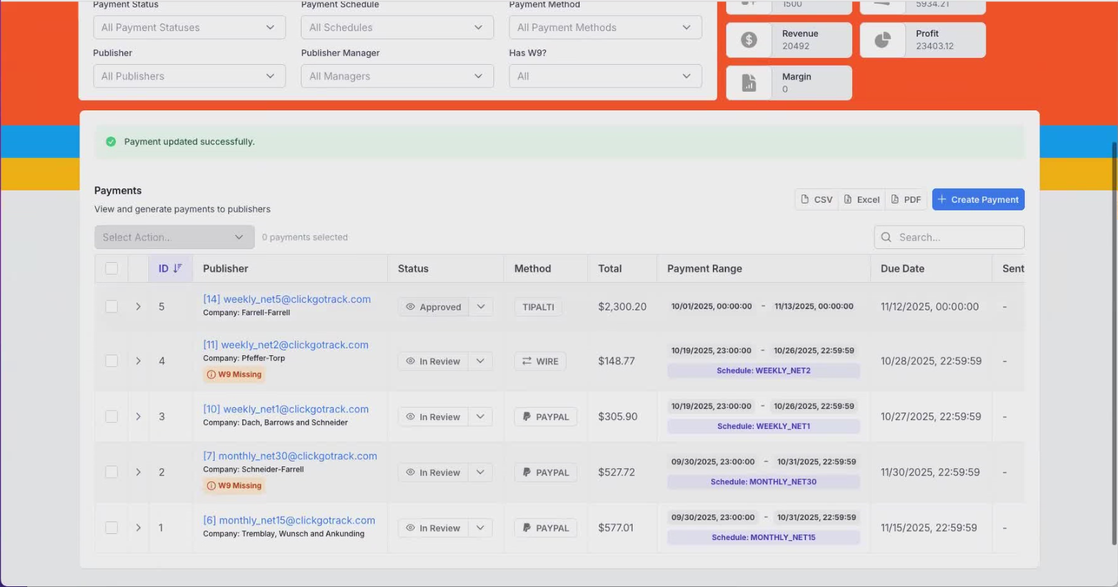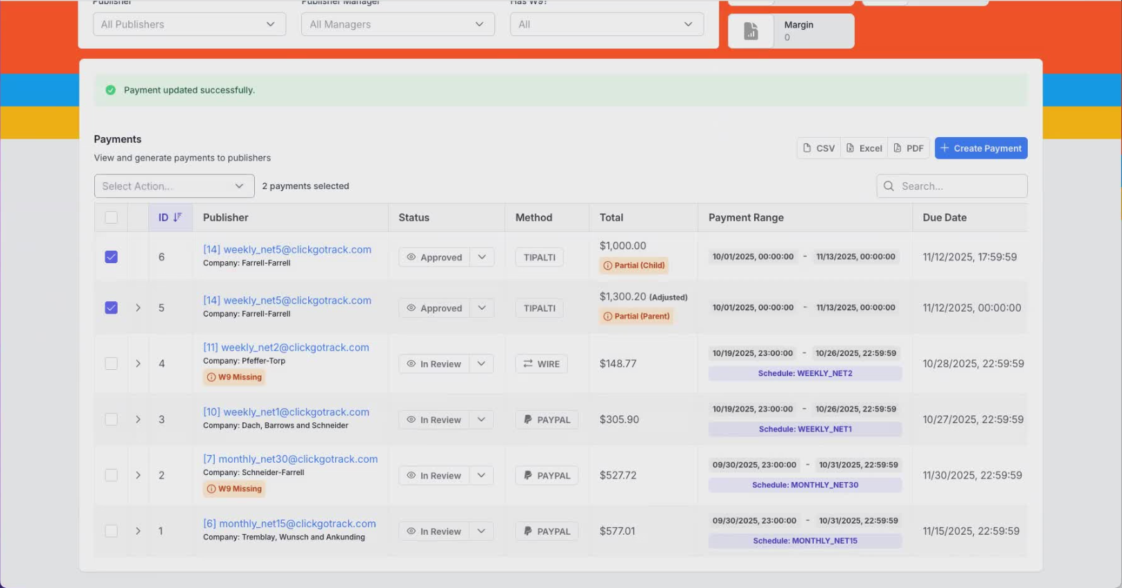 - The payment is created. If Tipalti onboarding has not been completed for the Publisher, "No Tipalti Account" appears in red below the Publisher name.
